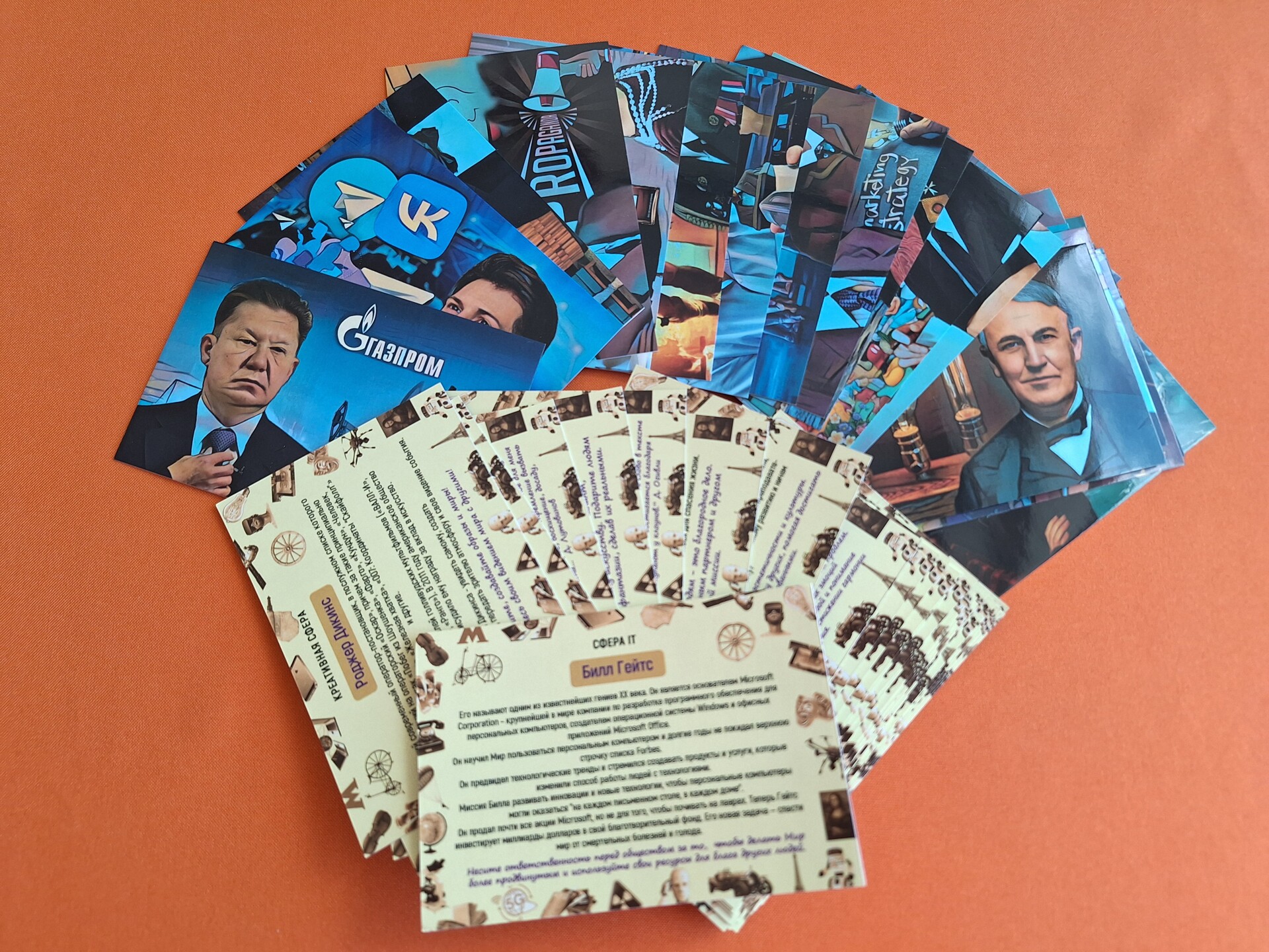 1) 80 двухсторонних карт (13 * 9 см на картоне 300 г/м2) с изображением и описанием выдающихся и значимых личностей прошлого и современности, внесших неоценимый вклад в жизнь и развитие каждой из 10 сфер деятельности — по 8 личностей к каждой сфере.